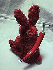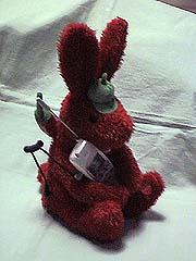 | ほんとに真っ赤なうさぎさん 携帯電話を持たせて受信すると、相手の声に反応して頭や口が動いて、まるで会話しているようです。 |