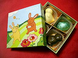 ゴディバ '04イースターコレクション4P 3種類の外箱の絵が一つの物語になっているのが素敵です。 こちらの中をあけると・・ 可愛いヒヨコ型のチョコと、 卵型のチョコが各2個。 |