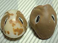 | 鼻の部分がもっと丸くなるように 削る。 でも、一番の「耳と目・・」と これをより近づける為に・・、 こんなに削ってしまいました。 右が元の大きさの顔の部分です。 かなり大きさが違います。 |