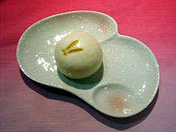 「月のうさぎ」菜の花 粒の大きな栗がまるごとひとつ入った栗まんじゅう。 赤い帯のほうは渋皮栗がはいっています。 |